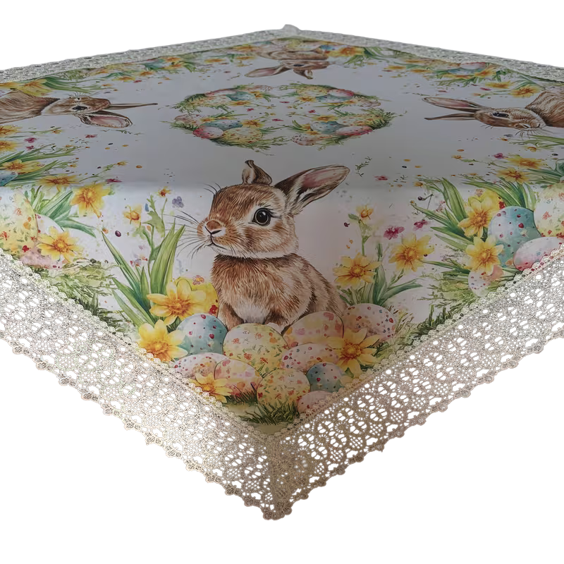 🌸🐰 Frühlings- & Ostertischdecke – Weiße Spitze, Eier- & Hasenmuster (90 x 90 cm) 🥚✨