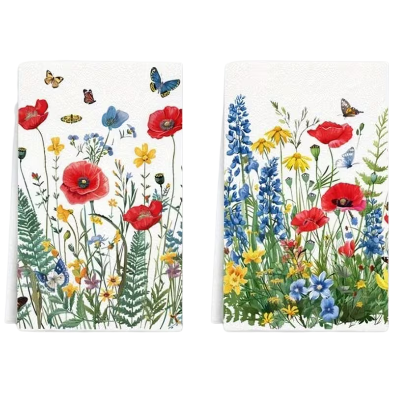Bring spring and a farmhouse feel into your home with these soft polyester dishcloths, decorated with butterflies, yellow daisies, and lupine motifs.