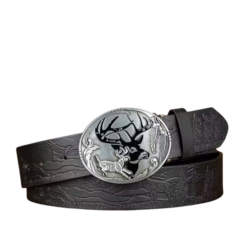 Stoer én stijlvol: deze herenriem heeft een grote gesp en een elliptisch zwart‑schaduwrand hertenmotief — perfect voor wie een alpine touch wil toevoegen aan z’n outfit.